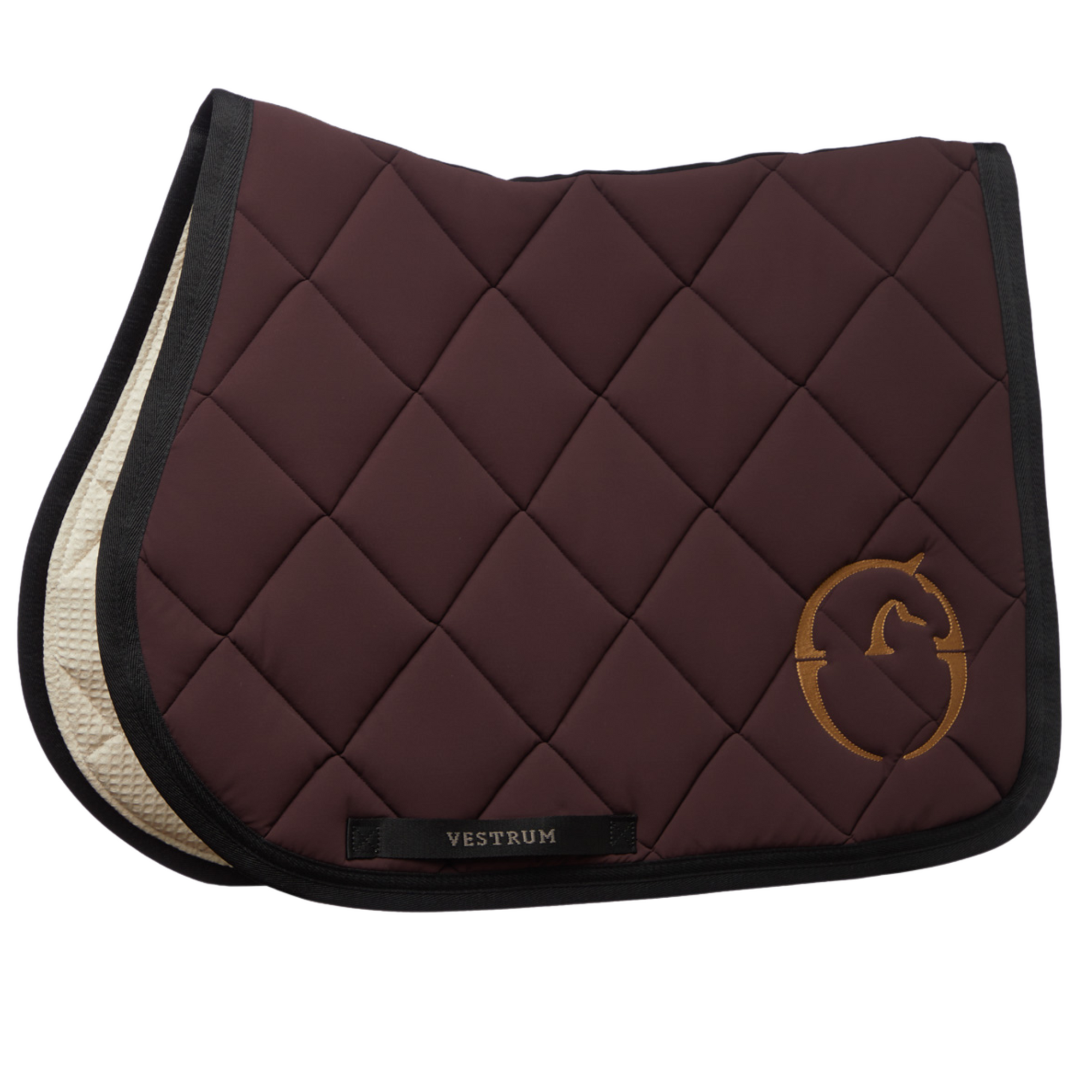 Label with Vestrum writing on both sides and embroidered logo sewn on one side