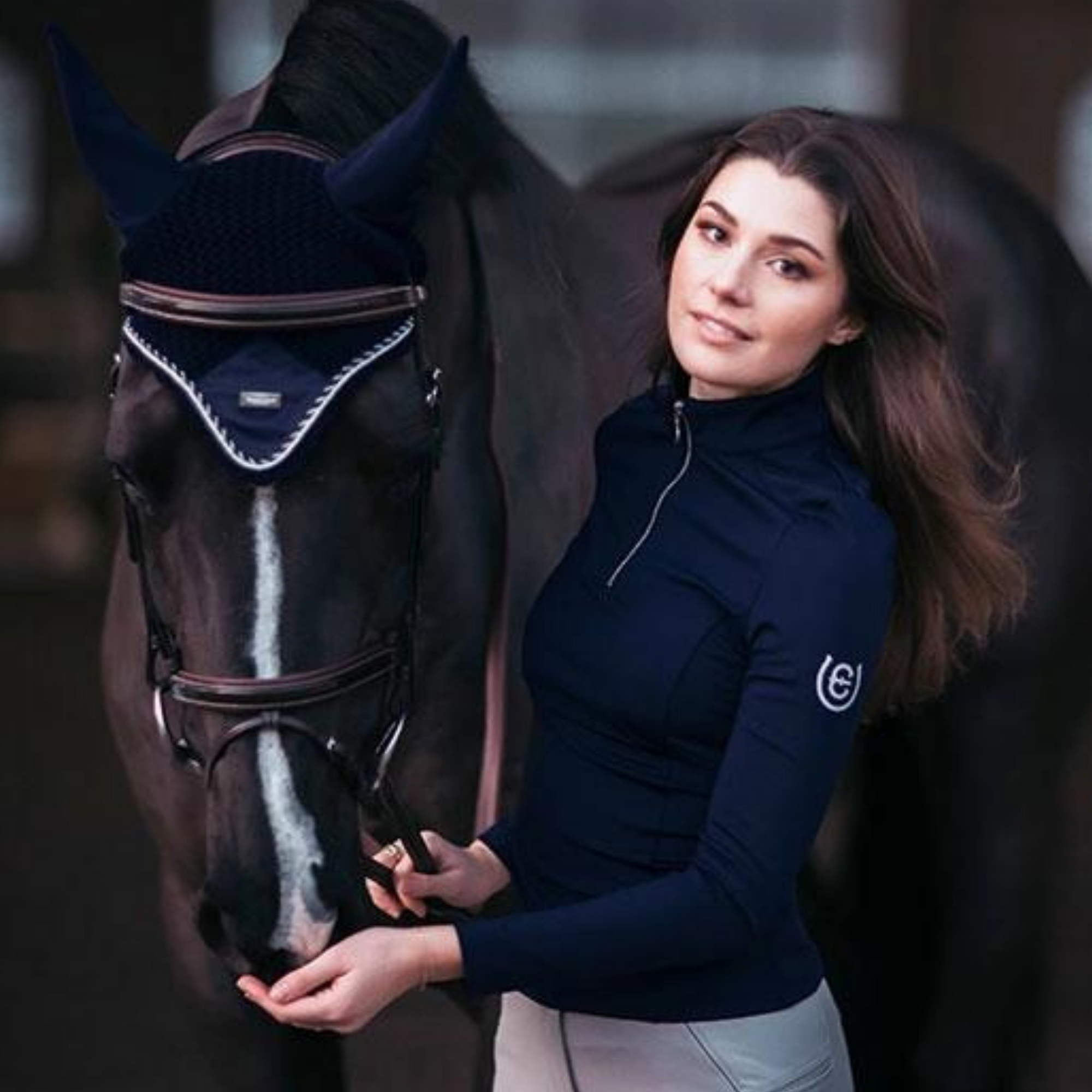 Color: Navy blue Details: Vertical Equestrian Stockholm logo on the back. Small Equestrian Stockholm logo on the left sleeve and on the right shoulder. Zipper: Silver YKK metal Material: 61% Nylon (30% nylon with coffee grounds), 9% Spandex