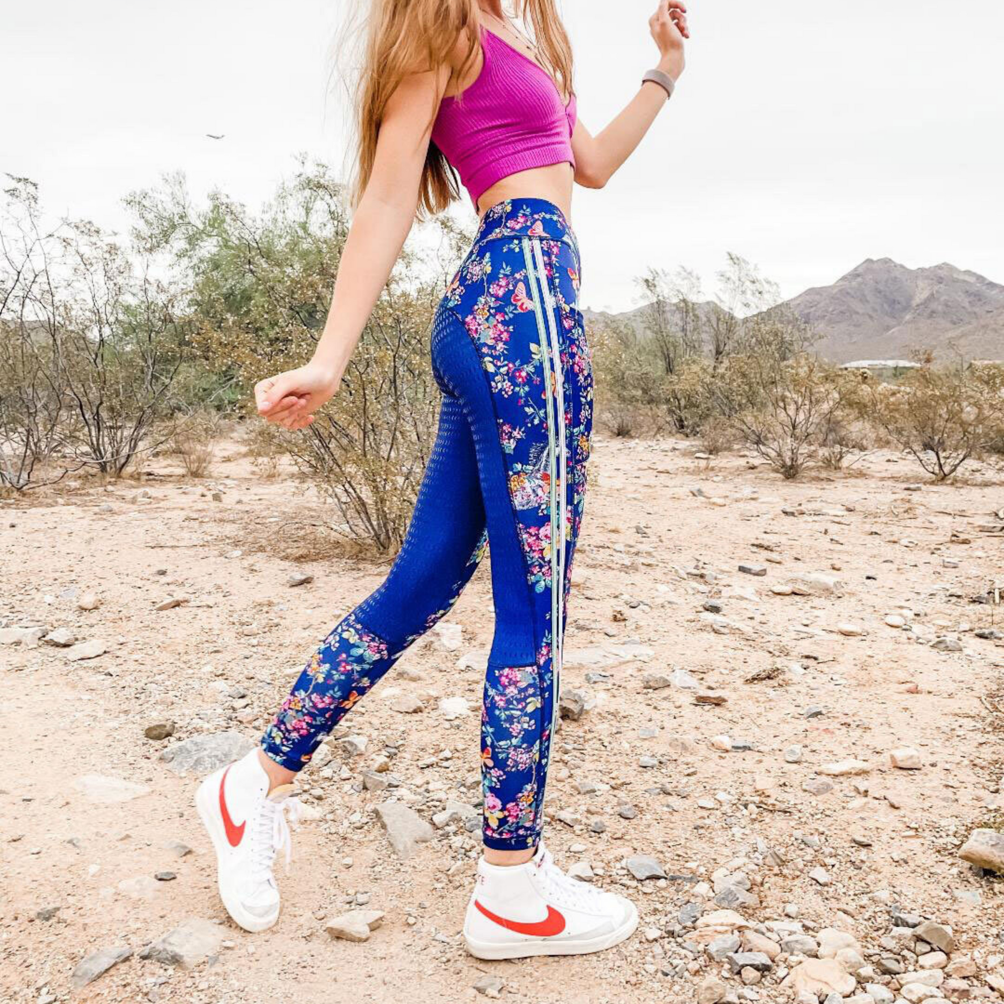 Blue covered in flowers, ponies and butterflies, these YOUTH sized Full Seat Rockstar schooling tights have white and green side stripes.