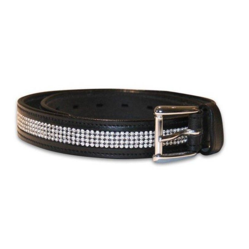 A staple in every Dressage rider's competition wardrobe - a black leather belt embellished with 3 rows of clear diamante.