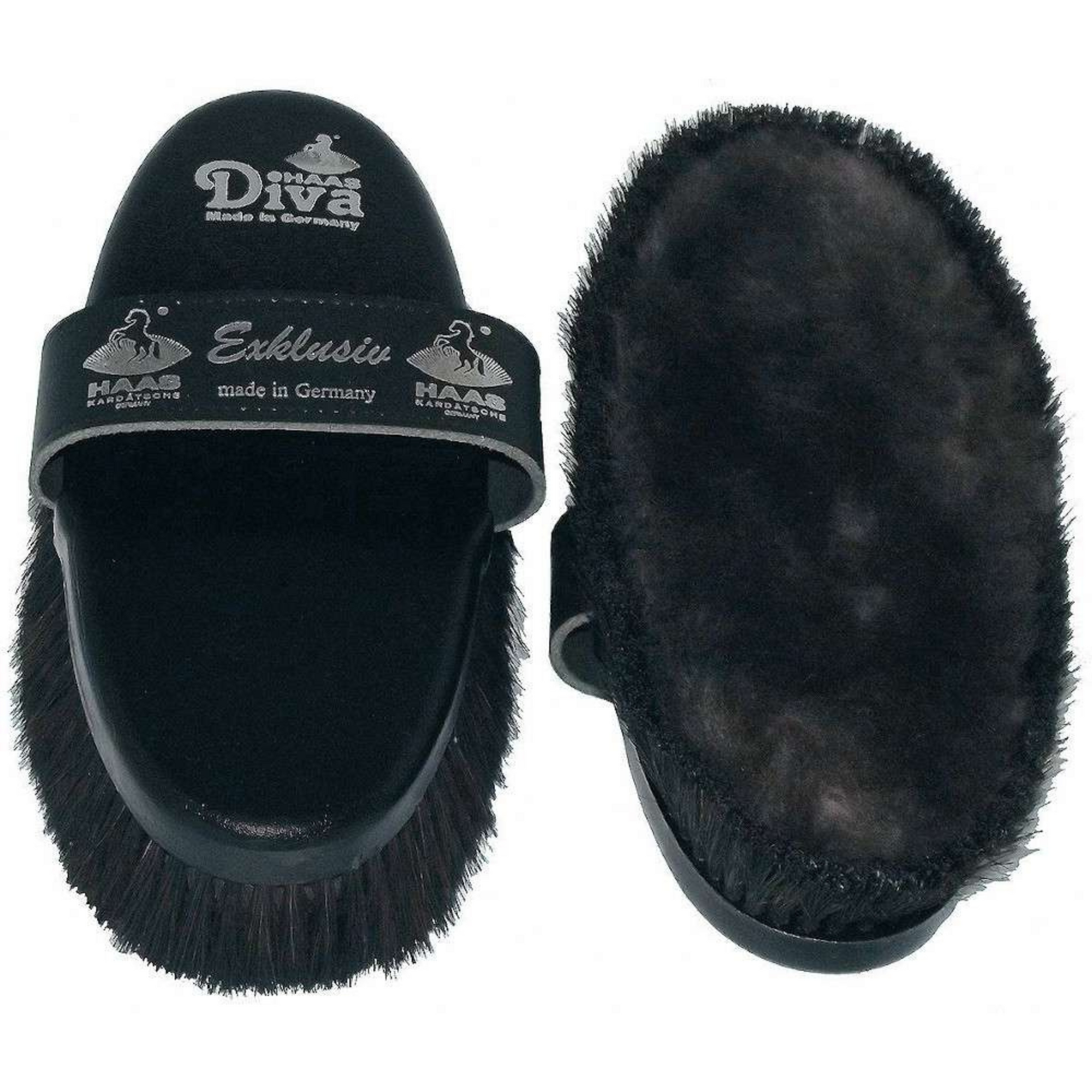 The Diva Exklusiv by Haas has a black lacquered brush head with a leather hand strap.