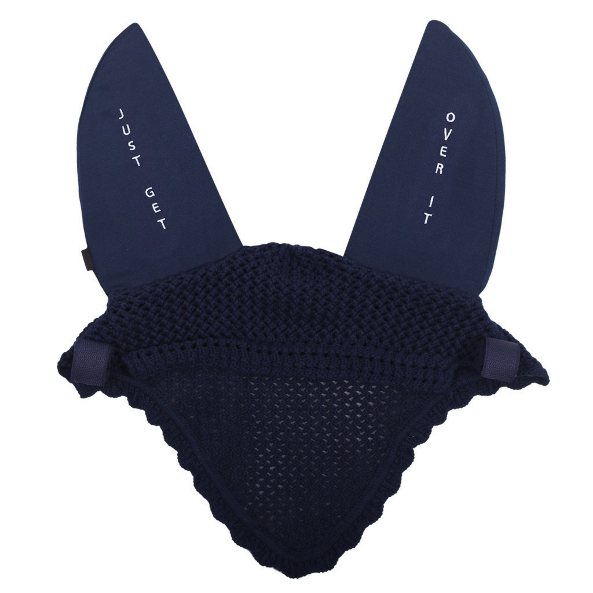 Ear bonnet with "Just Get Over It" embroidered on the back of the ears.