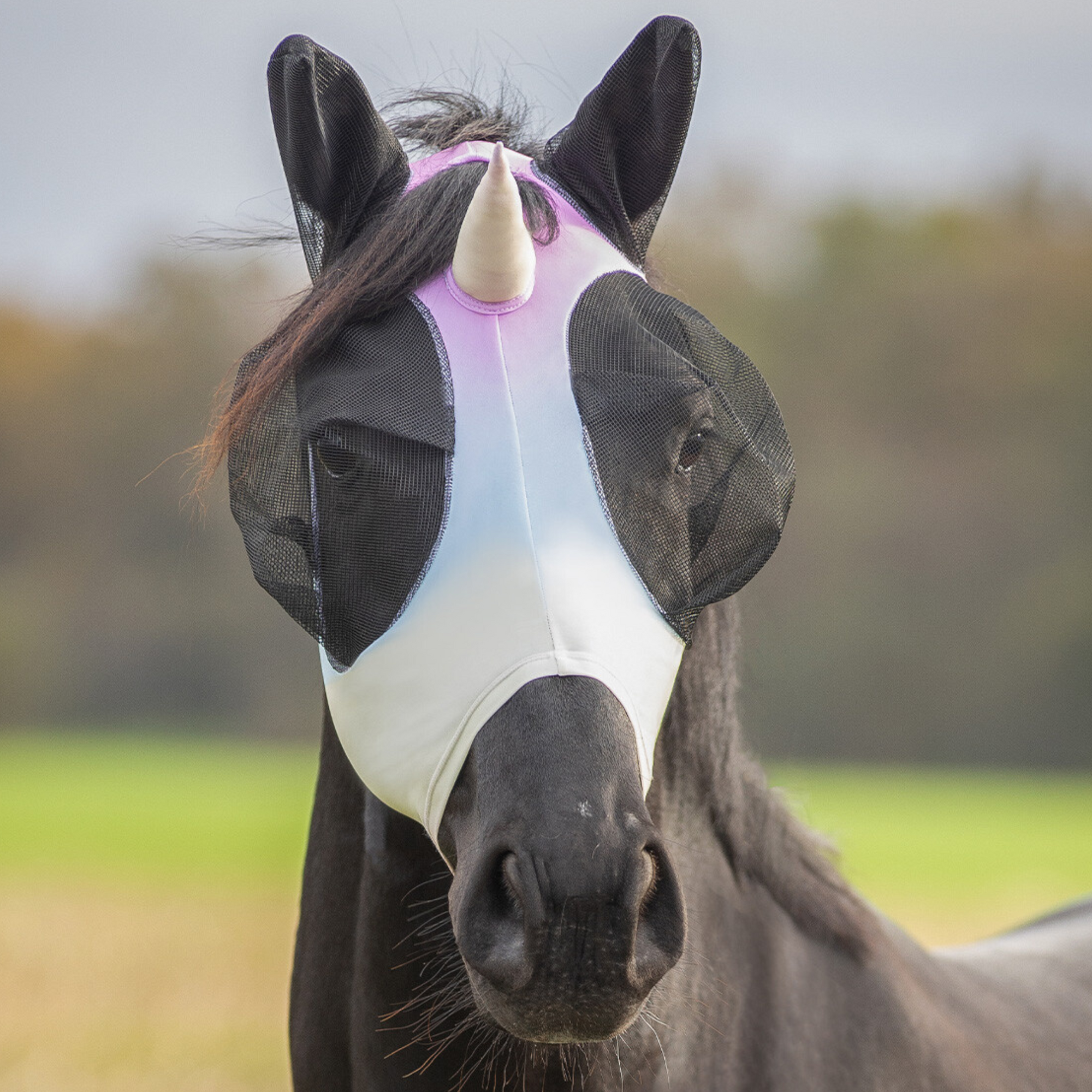 Fly Mask Unicorn, featuring a unicorn horn, is designed to make wearing a fly mask as comfortable as possible for the horse. The smooth and elastic fabric feels like a second skin.