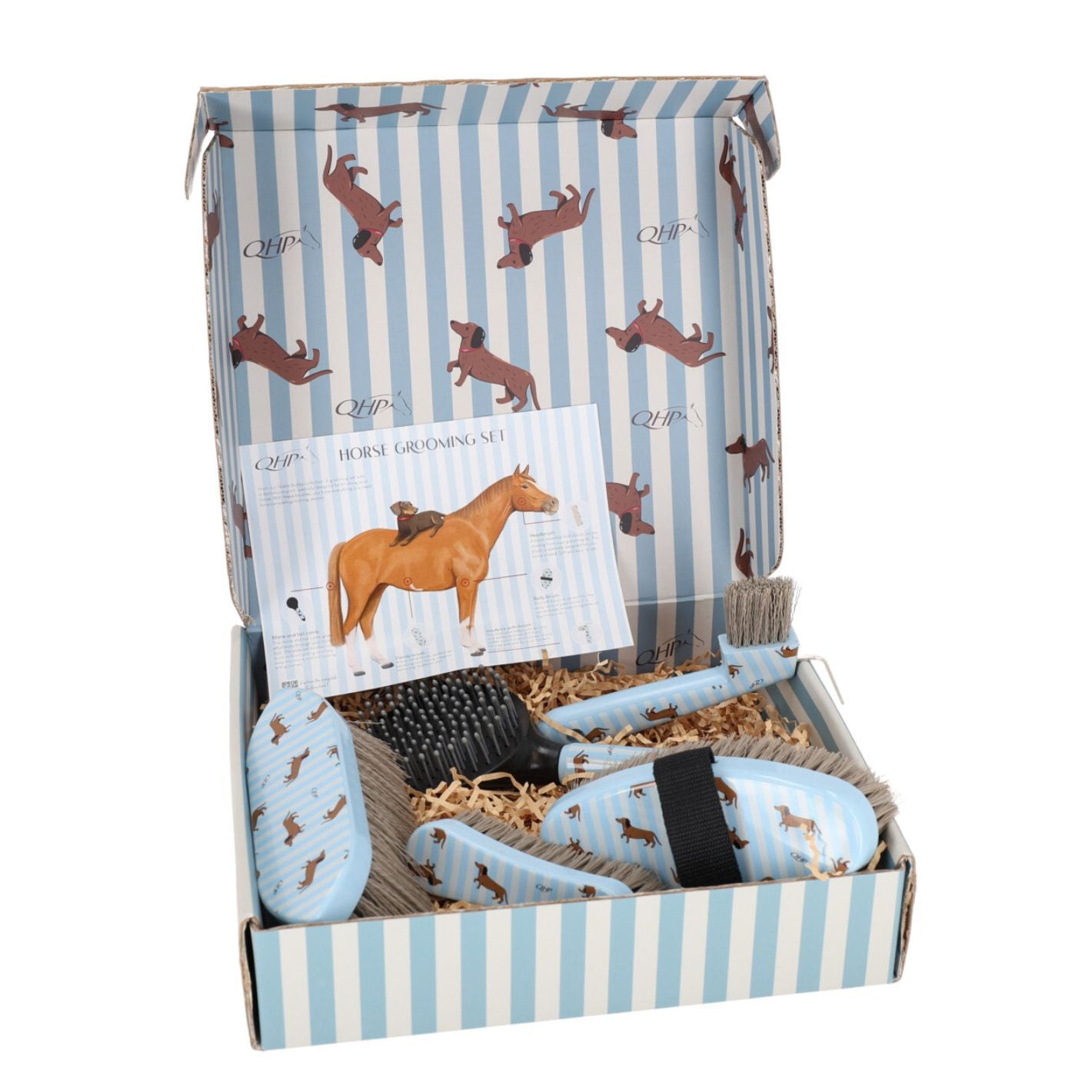 From our Stable Buddy collection: A grooming set with a dachshund print, specially designed for brushing your horse.