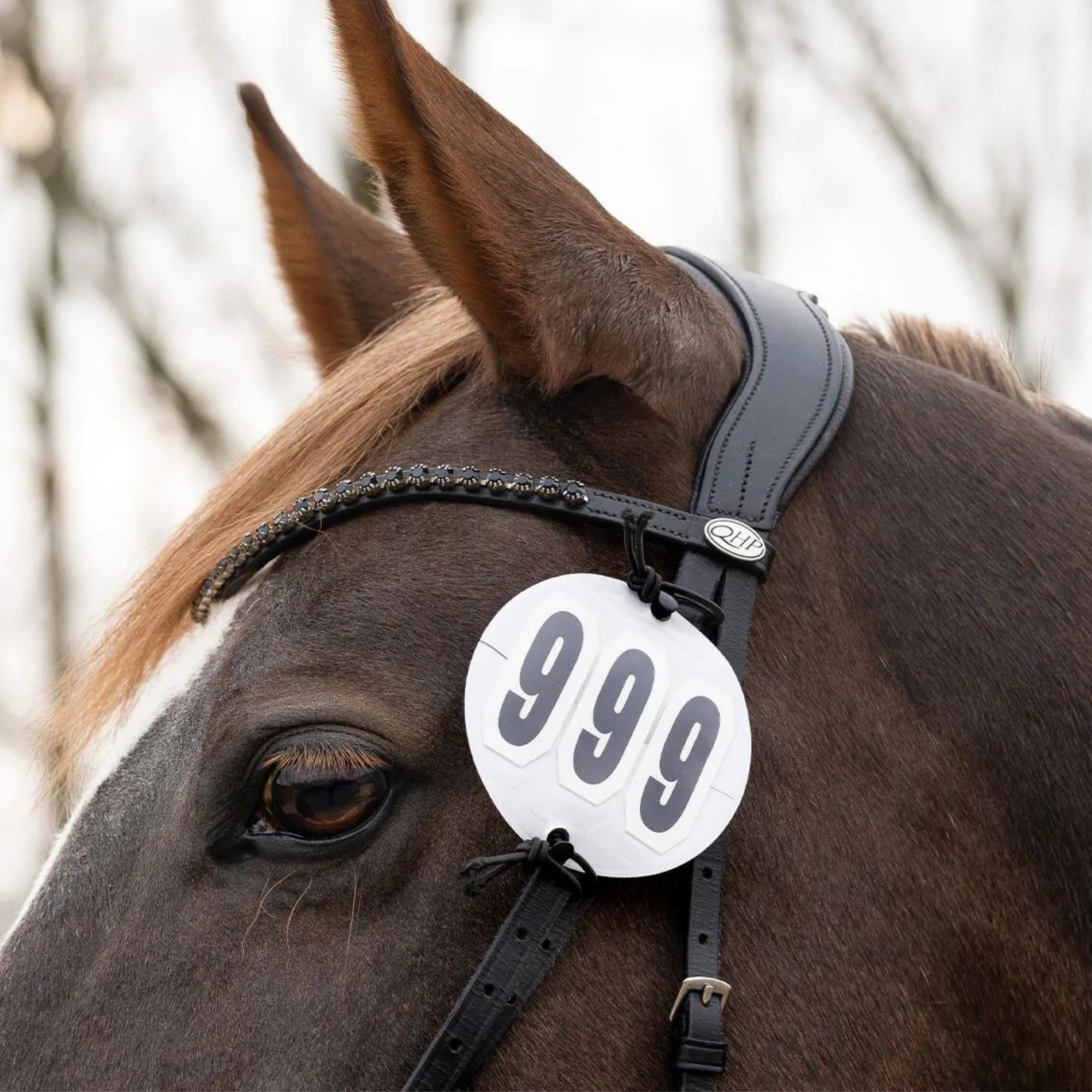 Chic number holder with numbers included and easy to attach to the bridle with elastics.