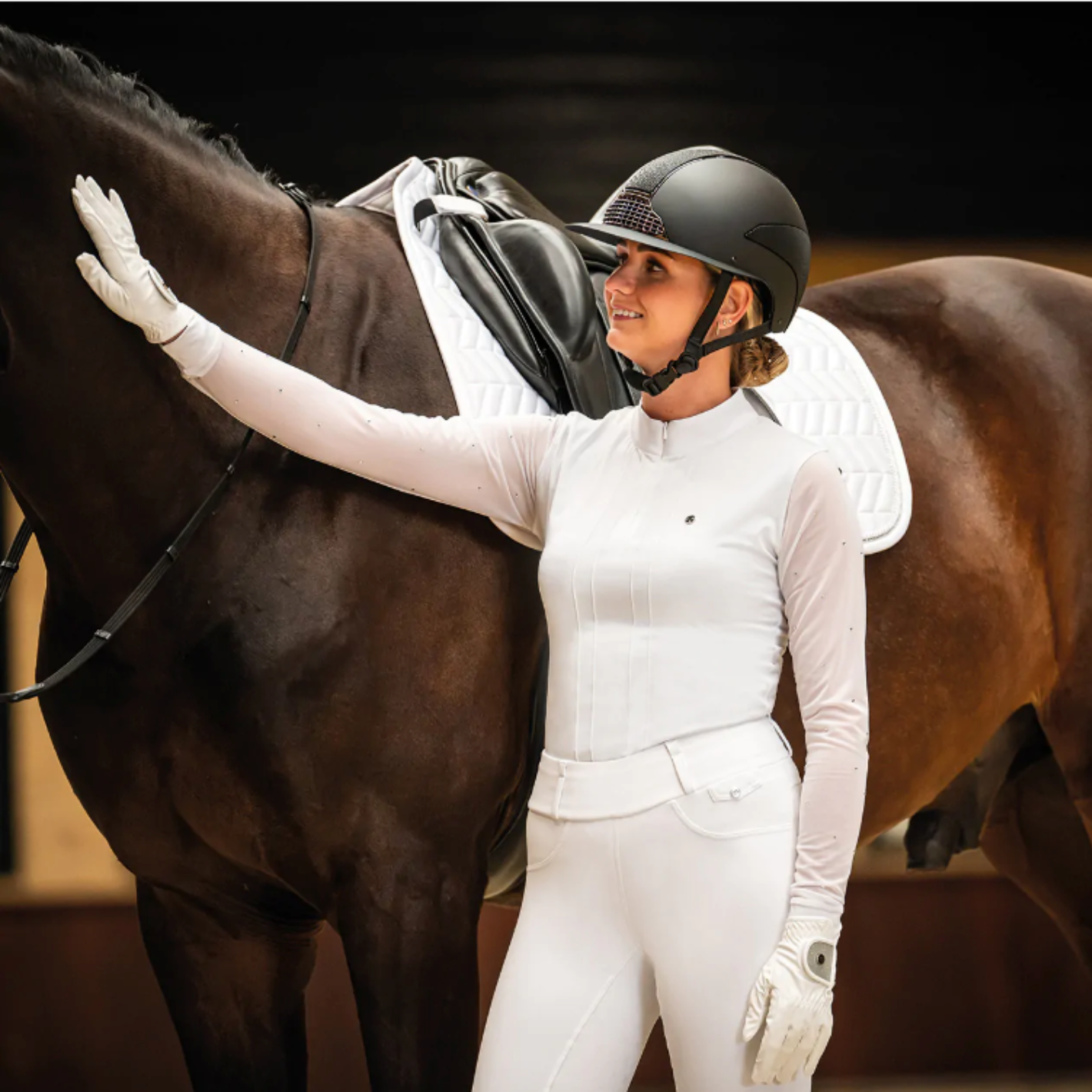 The Sennah long sleeve competition shirt features stretch mesh sleeves embellished with rhinestones.