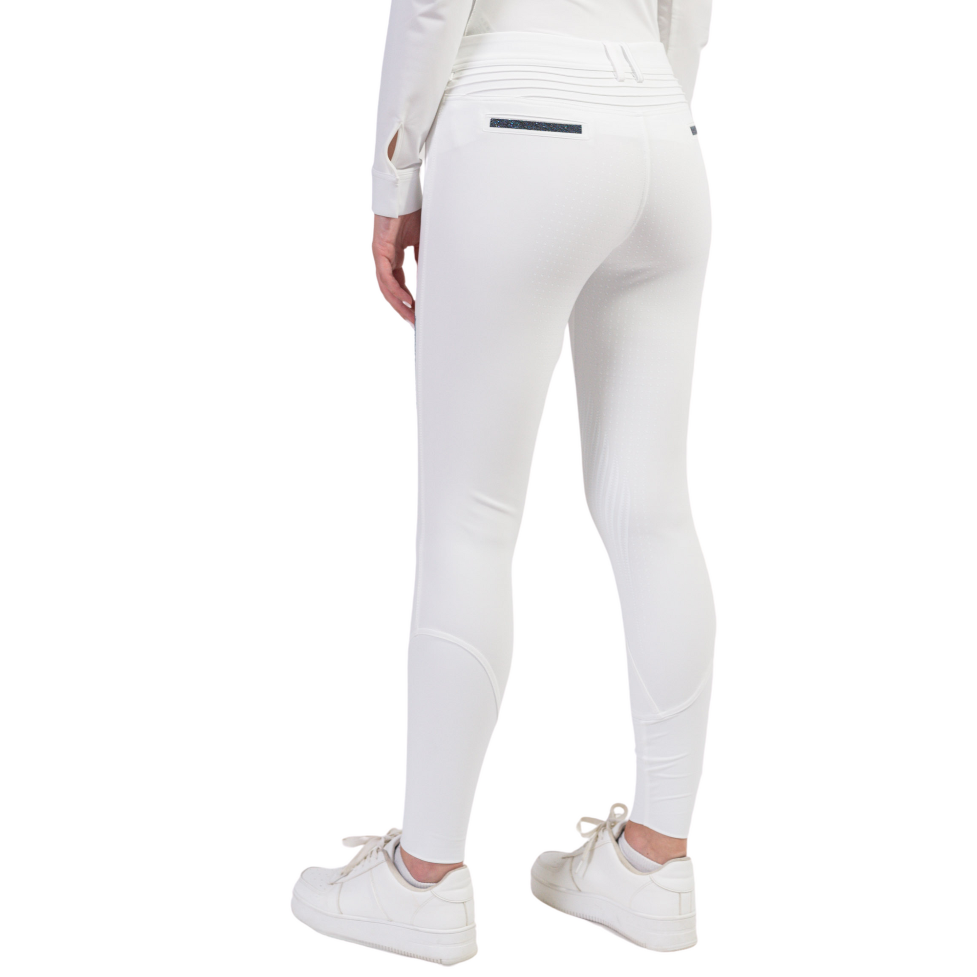 Designed in an high stretch and wearability resistant technical fabric, the Diane Metal Dots breeches offer a second skin effect for optimal comfort. The tailored design and the pleats on the back ensure a perfect fit for the rider. The silicone grip inside the belt prevents the shirt from rising and the compression fabric offers a perfect fit.